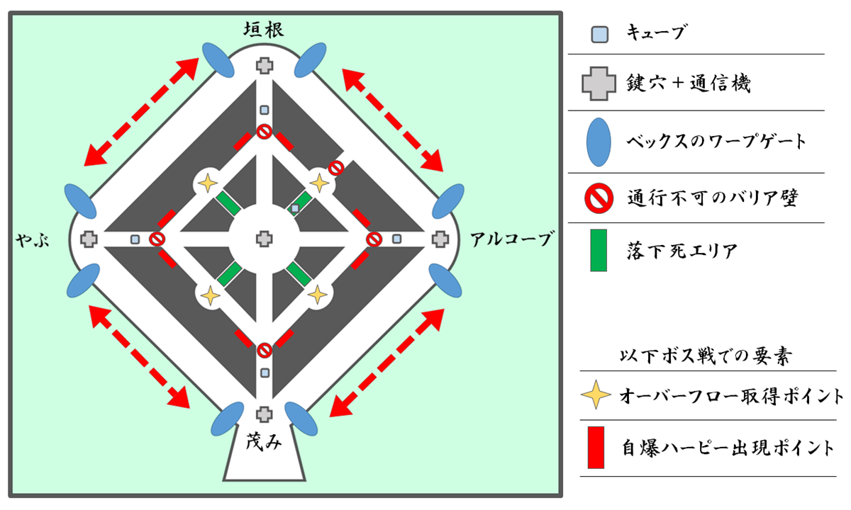 ボス撃破後にやぶと垣根それぞれへの通路の間にある落下死エリアにキューブがある。