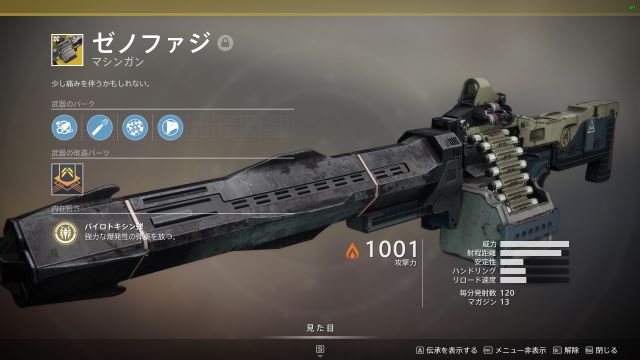 | 2019/12/11 | 2.7.0 | ・PvEでのダメージが+50%増加 ・PvPのヘビーウェポン弾薬補給箱について、最初に補給箱を開けたプレイヤーが受け取る弾薬数が4から6に、2人目以降が受け取る弾薬数が3から4にそれぞれ増加 ・別のパワーウェポンからこの武器に交換すると、この武器が全部の弾薬を獲得する問題を修正 |