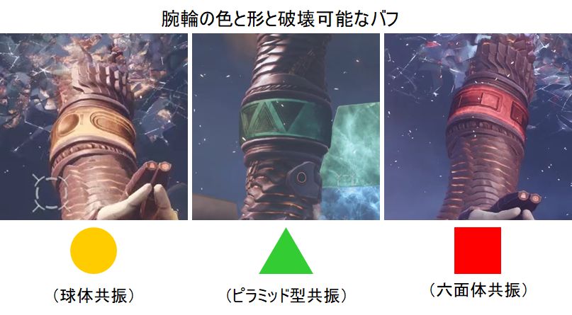 手首の色は手首破壊に必要な共振のデバフを表しており、それを付けてその手の攻撃予告エリア内から手首を攻撃すればグリフの破壊者のバフが付く。