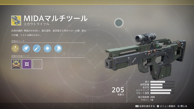 | スカウトライフル | - | 200 | エキゾチック | キネティック | プライマリ |