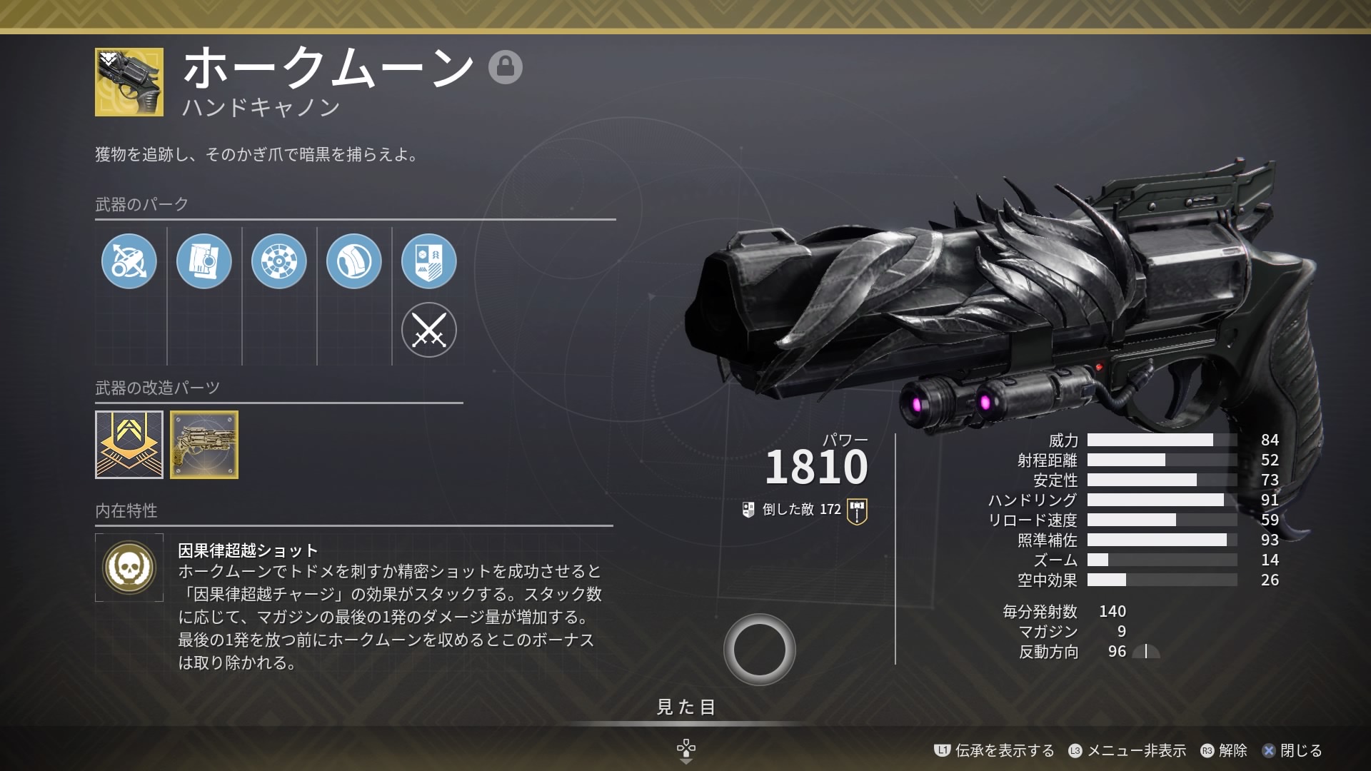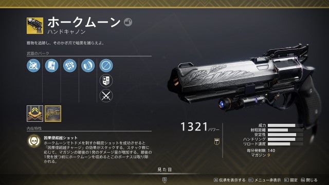 | 因果律超越ショット | ホークムーンでトドメを刺すか精密ショットを成功させると「因果律超越チャージ」の効果がスタックする。スタック数に応じて、マガジンの最後の1発のダメージ量が増加する。最後の1発を放つ前にホークムーンを収めるとこのボーナスは取り除かれる。 |
