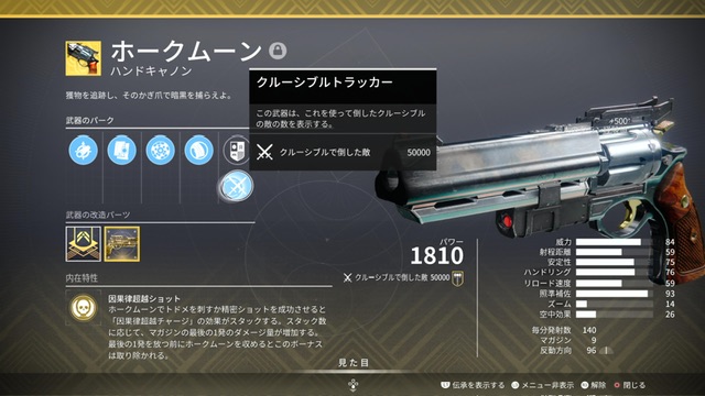 | 因果律超越ショット | ホークムーンでトドメを刺すか精密ショットを成功させると「因果律超越チャージ」の効果がスタックする。スタック数に応じて、マガジンの最後の1発のダメージ量が増加する。最後の1発を放つ前にホークムーンを収めるとこのボーナスは取り除かれる。 |