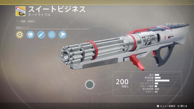 入手方法: エキゾチックエングラム(ドロップ率はとても低い) 「… 仕事… 大好き」 「なんてことを!」 彼女が目の前から走り去っていく前にそう言っていた。それしか覚えていない。黄金時代以前の戦争映画の一場面のようだった。主人公の友人が栄光に包まれて死に、主人公がその復讐を果たしにいく。ただ、映画と違うのは、彼女は死ななかった。死んだのは奴らだ。トイレを我慢していたかのように、落ち着きのない足取りで狙いはバラバラだったが、あらゆるものにバンバンと当たった。蜘蛛も恐れて逃げていった。だが、彼女が手を止めた時、何も動いていなかった。彼女は私達を助けたのだ。 特徴