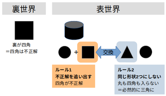 表世界は、(1)裏世界と合致する形状を含んでいる場合それを移動させる、(2)同じ形状2つとならないよう移動させる、のルールに従い操作を繰り返す。