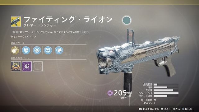 | 2020/3/11 | 2.8.0 | ・グレネードランチャーの武器タイプに関するバックエンドの変更に伴い、ファイティング・ライオンにも微調整を追加。 ・連射速度が毎分72発から90発に上昇。 ・PvEでの直撃ダメージを35に変更(変更前は27)。 |