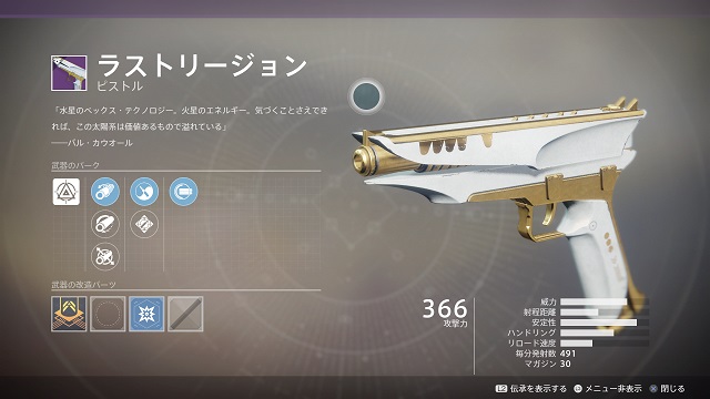 DLC「ウォーマインド」で追加されたレイド・ゾーン「星々のスパイア」で入手可能なピストル。