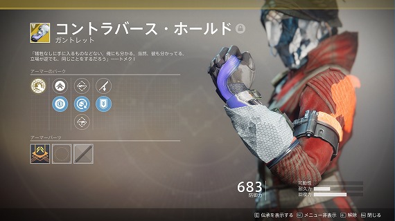 ・グレネードボタン長押しによるチャージアクション中、敵から受けるダメージを6割に抑える。 PvPではショットガンやタイタンの近接スキルなどの強力な即死攻撃を耐えられる。こちらはグレネードで即座に反撃できるため、偶発戦に強い。 当然だが、グレネードエネルギーがなければ発動できない(溜める動作ができない)。