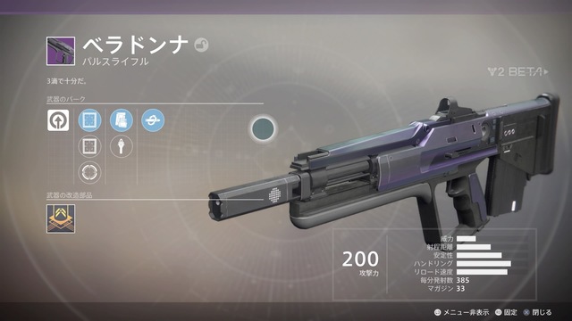 | パルスライフル | 軽量フレーム | 450 | レジェンダリー | キネティック | プライマリ |