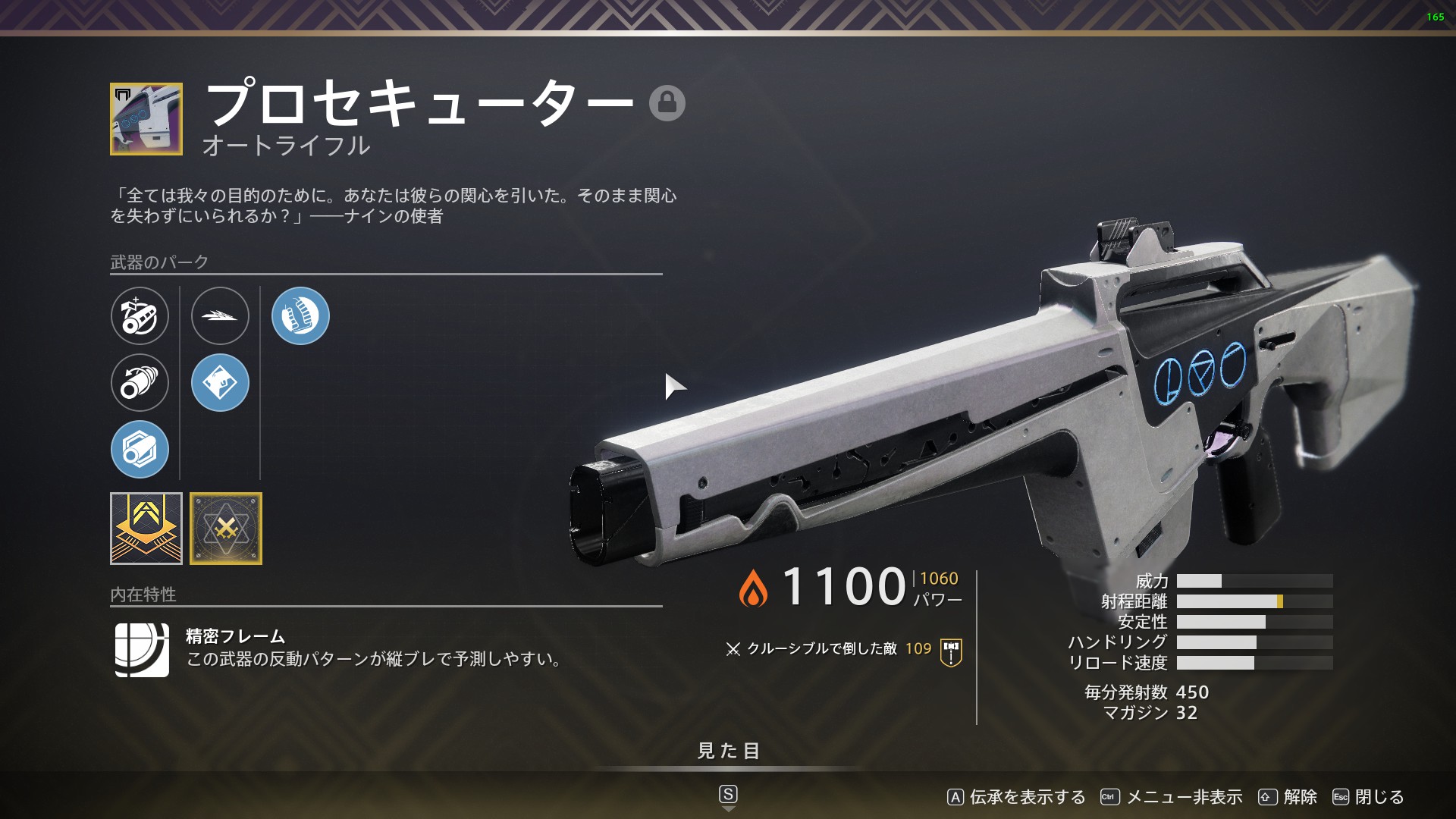| オートライフル | 精密フレーム | 450 | レジェンダリ | アーク | プライマリ |
