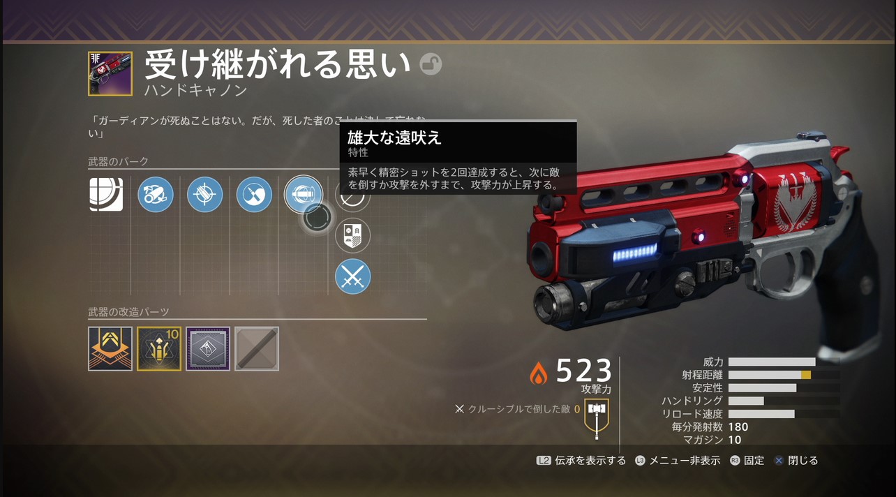 | 2019/6/5 | 2.5.0.1 | ・レートを180から150に変更:ダメージも150RPM(軽量フレーム)ハンドキャノンに合わせて調整した。 →この武器は未だに精密フレームハンドキャノンの武器タイプの利点と発砲アニメーションを保持している。 ・「雄大な遠吠え」の効果を以下の通り変更。 →2発の精密ヒットを素早く達成すると、次の射撃のダメージと射程が増加する。 →ダメージ増加は非精密ダメージにのみ影響する。しかし、ボーナス射程はそれとは無関係に適用される。 ・特定のネットワーク状況下で「雄大な遠吠え」の効果の発動が遅くなる問題を修正。 |