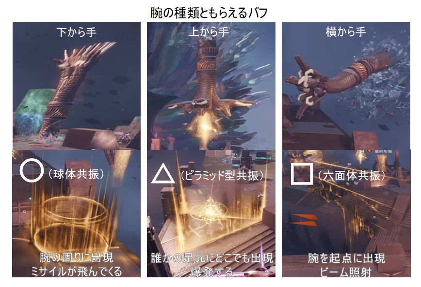 手首の色は手首破壊に必要な共振のデバフを表しており、それを付けてその手の攻撃予告エリア内から手首を攻撃すればグリフの破壊者のバフが付く。