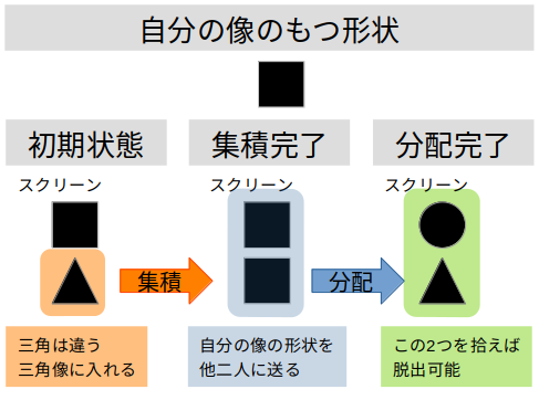 ただしこれを満たしても脱出できない、2ターン目3人目が表世界に戻ったタイミングで失敗したという報告もあり、正しいのかバグっているのか分からない。