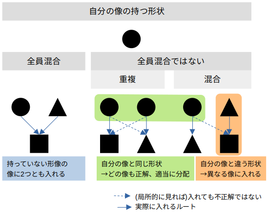 表世界の右像→裏世界の右像に入れる、前ターンで最後に入れた像に次ターンで最初に入れる、のいずれもアウト。